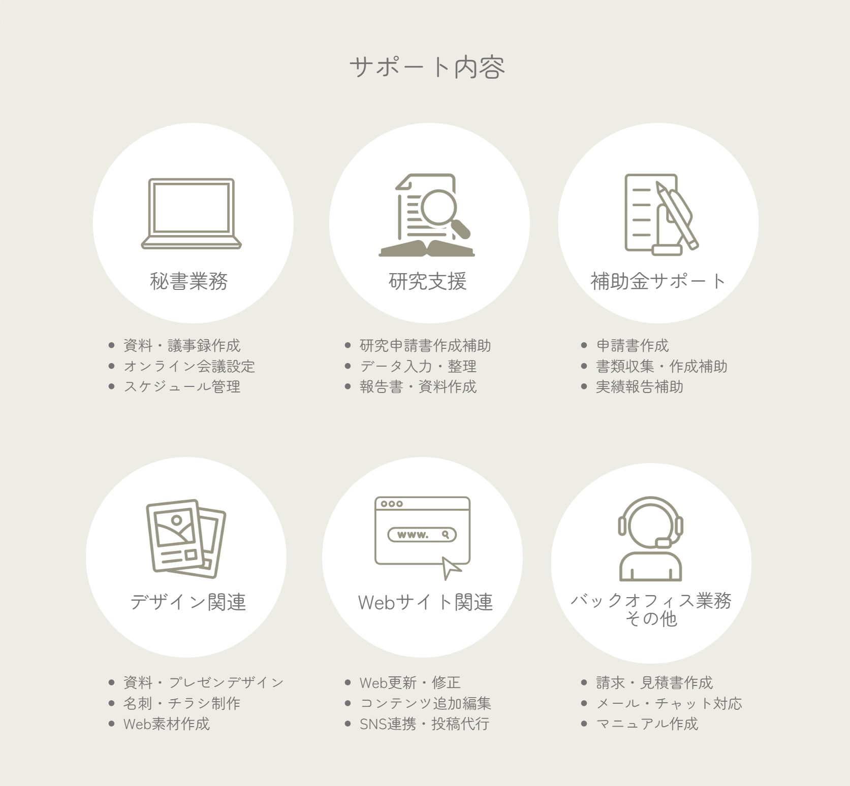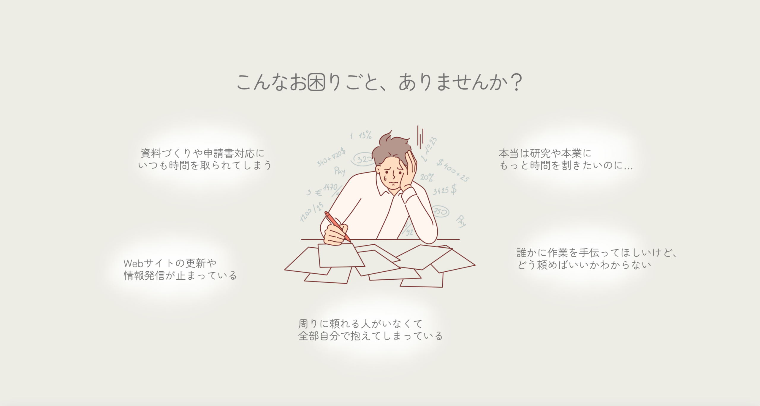 事務作業に時間を取られている研究者や専門職の方が、本業に集中できるようお手伝いします。スポットでも継続でも、お気軽にご相談ください。