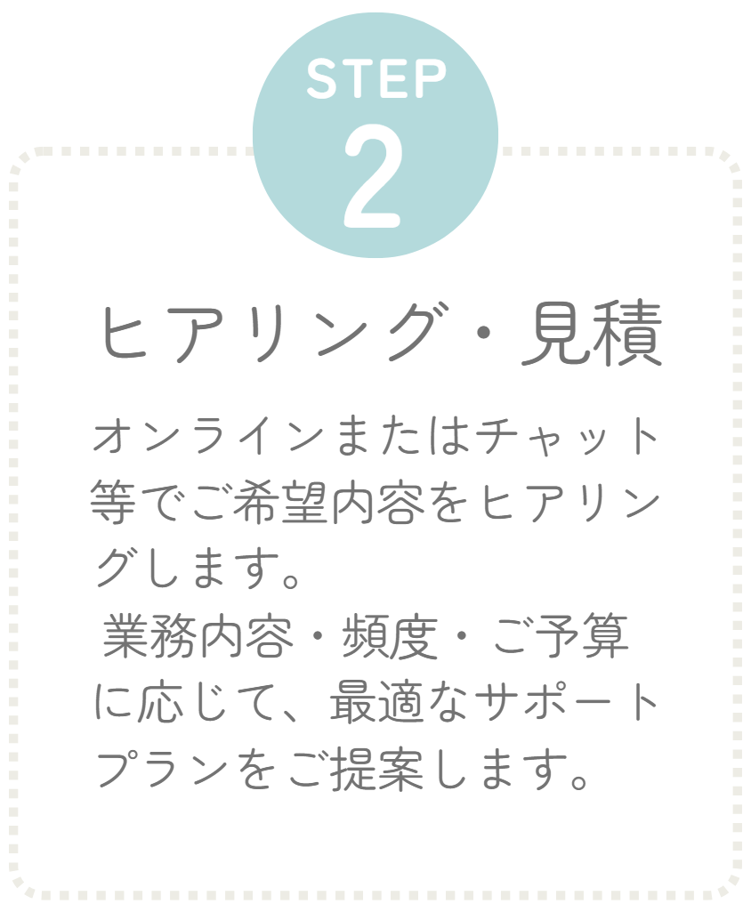 たとえば「この資料だけ整えてほしい」「一度だけ日程調整をお願いしたい」といった内容でも対応可能です。お気軽にご相談ください。